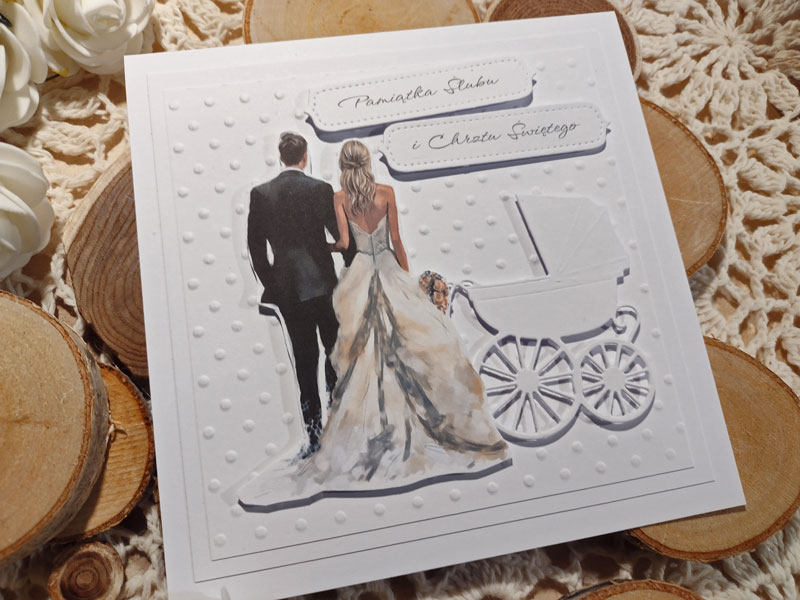 • ozdobiona drukowaną i wycinaną grafiką młodej pary z wózkiem